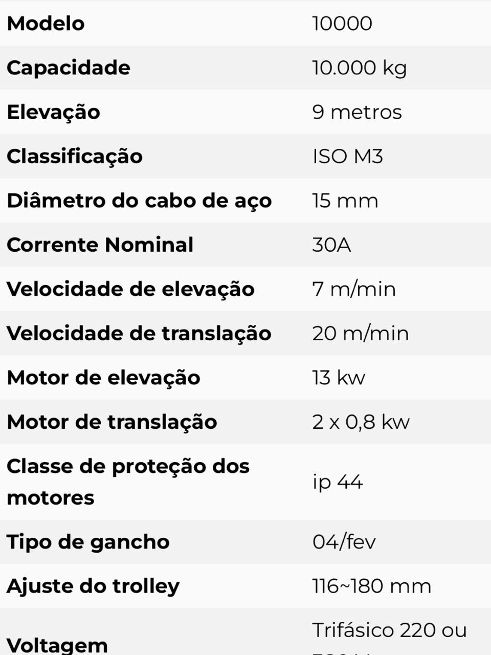 Cód.: PRT-184Vendo Talha Elétrica nova capac. 10 ton. – sem uso