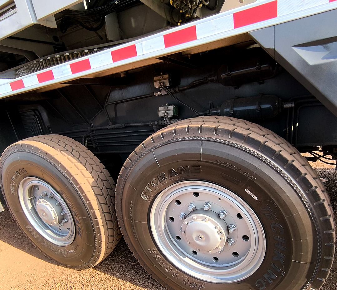 Com 4 eixos; pneus grandes; lança treliçada de 210 pés